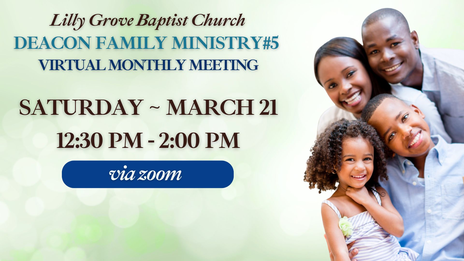 The plan for the Lilly Grove Deacon Family Ministry is accomplished when the deacon leadership join the Pastor in ministering to the physical, spiritual, and emotional needs of each church member and family. Church families are divided into groups of twenty or more families. Each group of families are then assigned to a deacon who will minister to them over a period.
