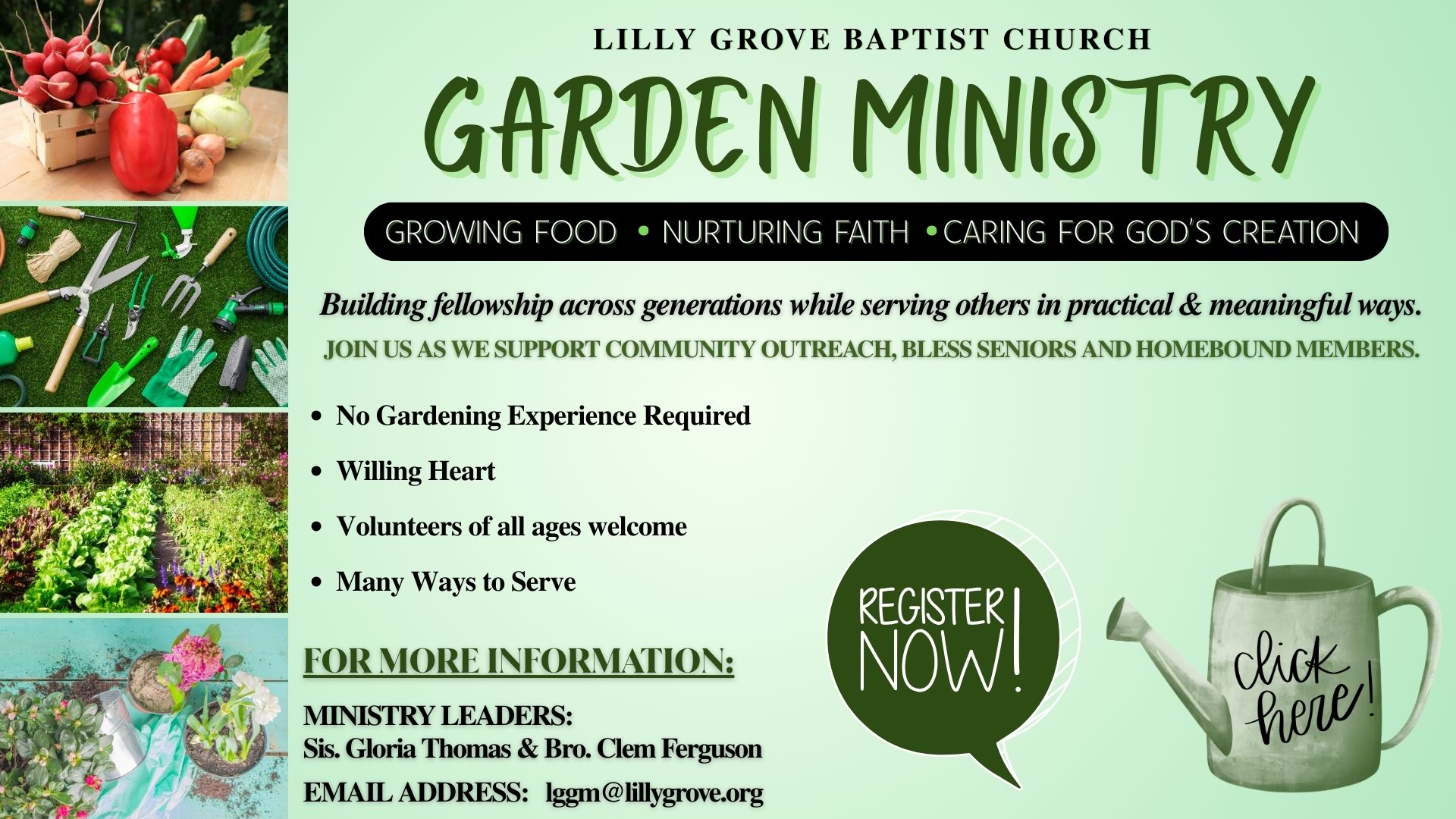 We are excited to announce the launch of our GARDEN MINISTRY, a new ministry dedicated to growing food, nurturing faith, and caring for God’s creation. Through this ministry, we hope to build fellowship across generations while serving others in practical and meaningful ways. No gardening experience is required—just a willing heart. Volunteers of all ages are welcome, and there are many ways to serve, including: planting, watering, harvesting, garden care, prayer support, teaching children, and helping with outreach deliveries.