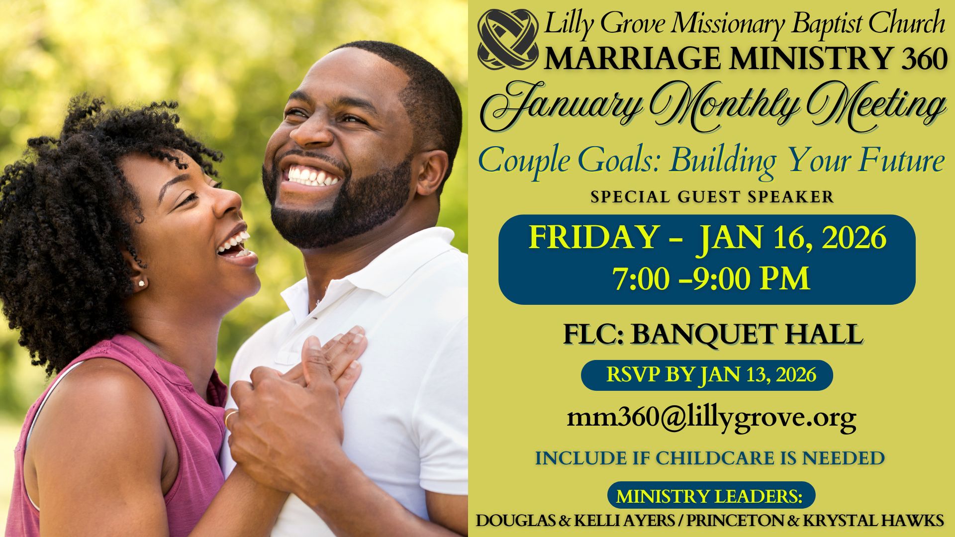 Marriage Ministry 360 (MM 360) mission is to strengthen, empower and uplift couples in every stage of marriage. Couples discover God’s sovereign plan for marriage through an activity-based curriculum centered on uncovering the true blessing of a healthy marriage, rooted in Christ.