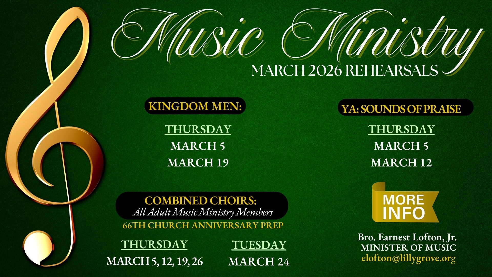 The Lilly Grove Missionary Baptist Church Music Ministry prepares the hearts and minds of worshippers attending the in-person and online worship experiences and special occasions through singing & praise.