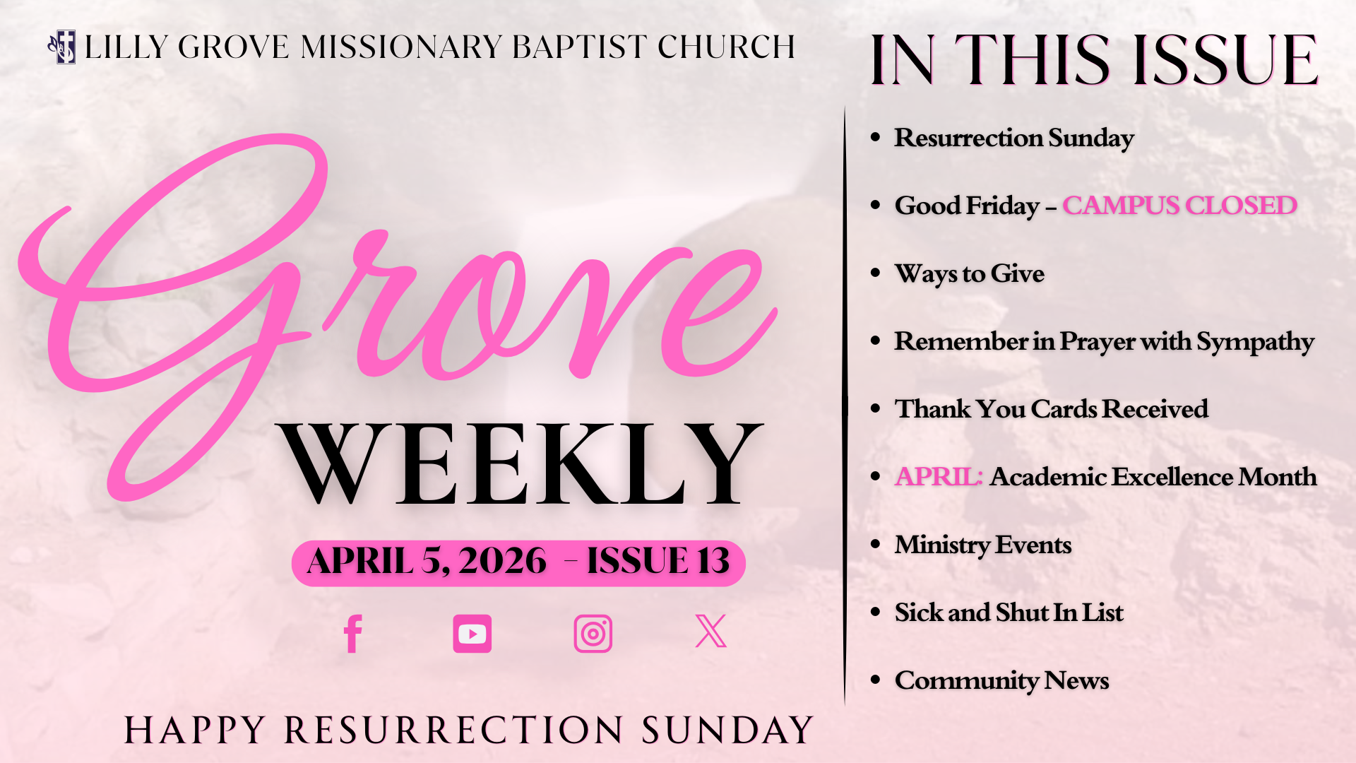 The Grove Weekly is a digital publication of the Church Newsletter. This publication includes the current events of the Lilly Grove Church, including, Ministry Events, Prayer Lists, Church Annual Days, and Community News.